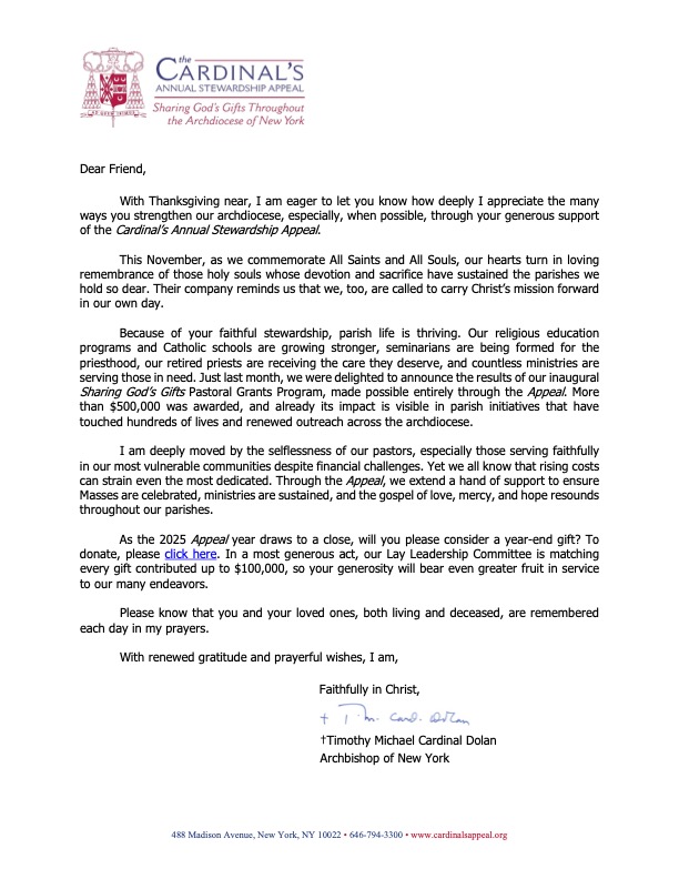In 1979, Terence Cardinal Cooke started the Cardinal’s Archdiocesan Appeal to facilitate the pastoral, educational and charitable works of the Archdiocese of New York. In the 40 years since, the Appeal has raised many millions of dollars – every penny of which has benefited parishes and the 2.7 million Catholics of the Archdiocese of New York.